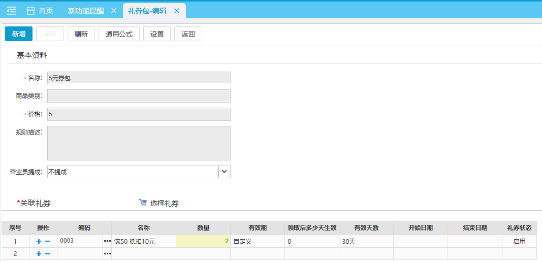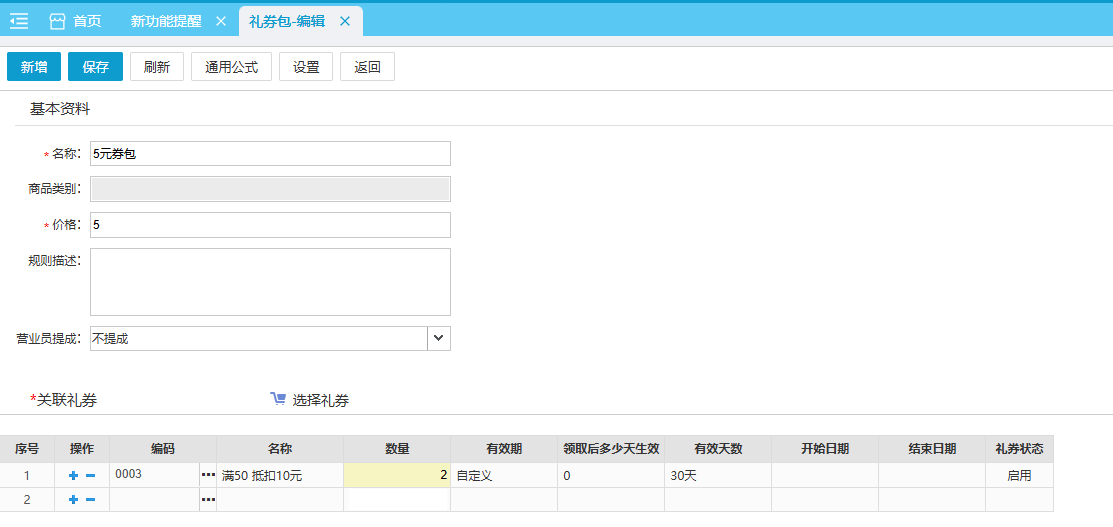 在列表中设置每张礼券的数量保存。