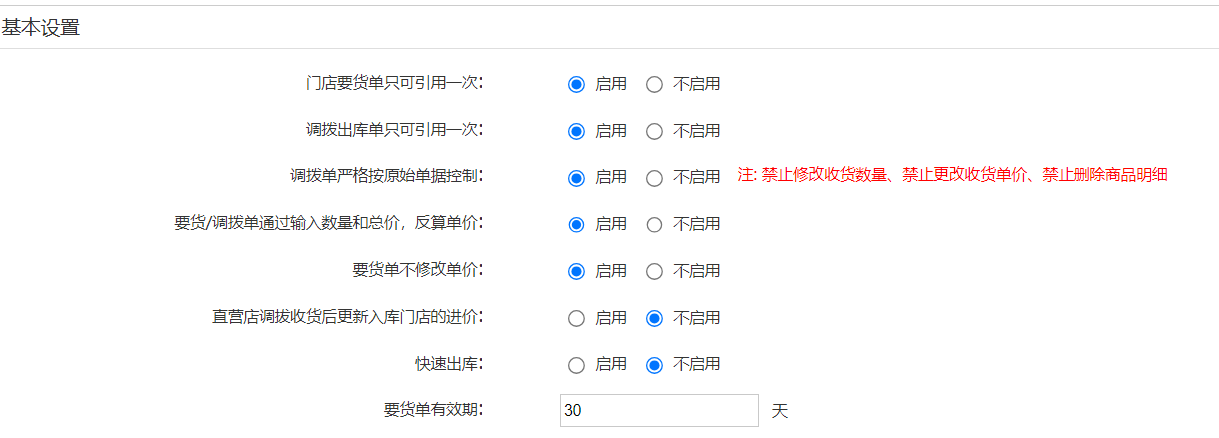 启用:调拨收货单(被调拨出库单引用)、调拨出库单(被门店退仓单引用)仅可被引用一次。