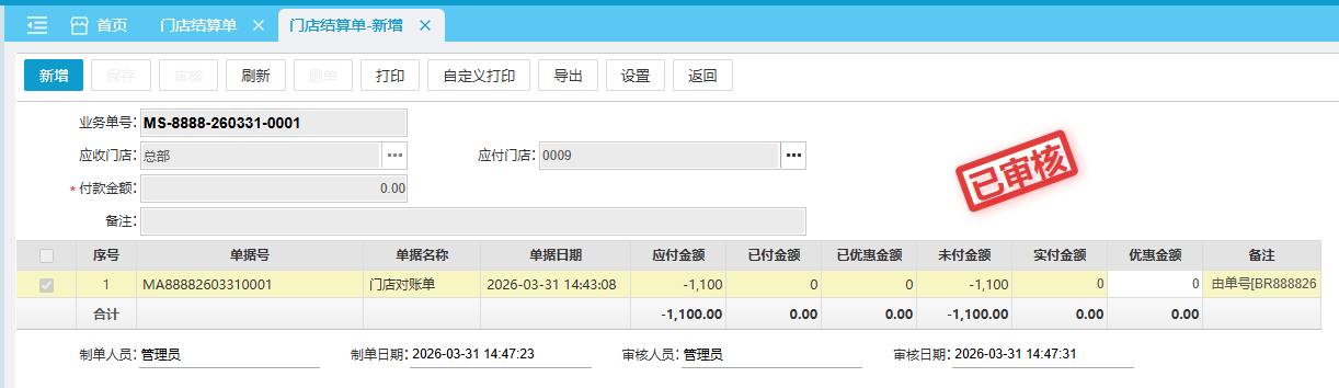 客户结算单中选择应付门店,付款方式、结算门店、选择结算统计时间,点击统计,会自动统计应收门店与应付门店之间已审核的对账单单据,录入实付金额或优惠金额,保存审核即可生效。