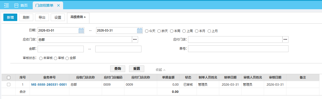 门店结算单用于门店与其他门店的账款结算的管理。