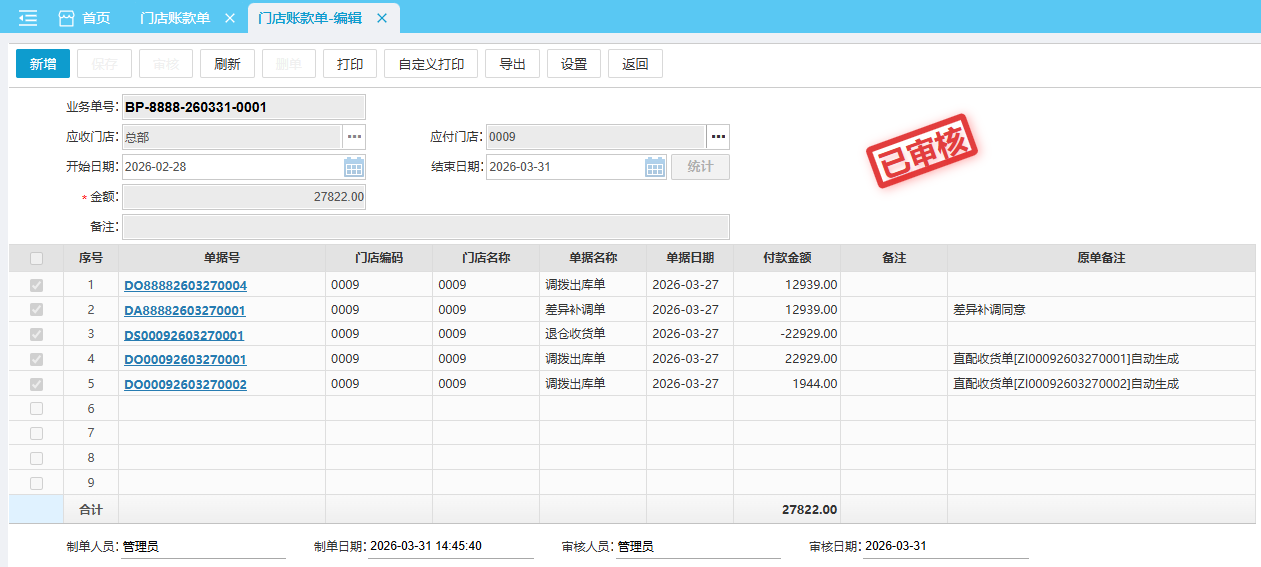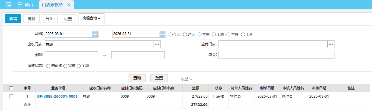 门店账款单用于门店与门店之间发生调拨业务或账款业务后,计算门店与门店之间的往来账款。