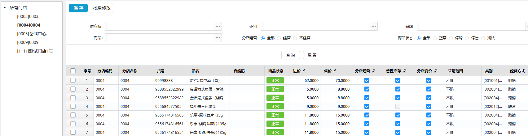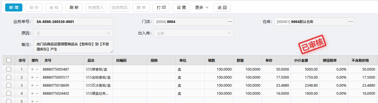 位置:【档案】-> 【基础信息】-> 【门店商品配置】 从 【门店商品配置单】中进行获取, 对应进价、售价、分店经营、分店变价属性 可以相应调整并同步修改 如图所示 注:门店商品档案从【管库存】到【不管理库存】,同时生成库存调整单进行处理 库存调整单会备注“由门店商品设置调整商品从【管库存】到【不管理库存】产生” 如图所示 文档更新时间: 2026-03-20 05:34 作者:zhangyi