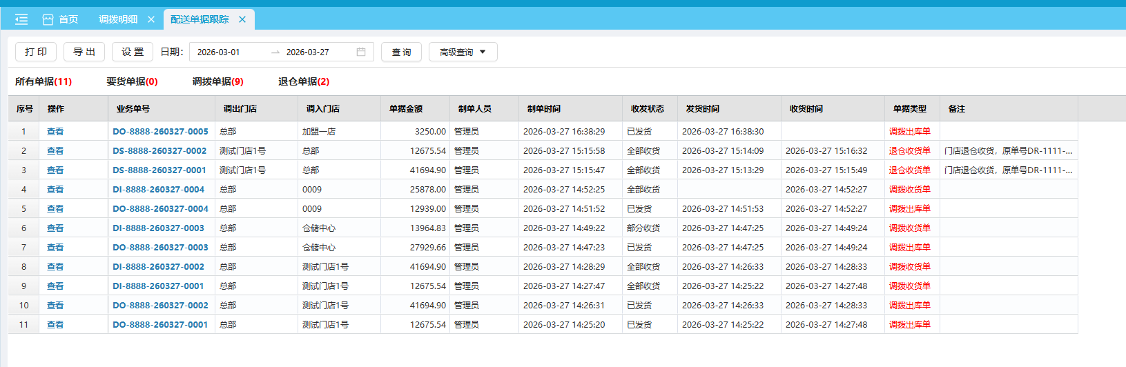 (3)支持单据:要货单、调拨出库单、调拨收货单、门店退仓单、退仓收货单