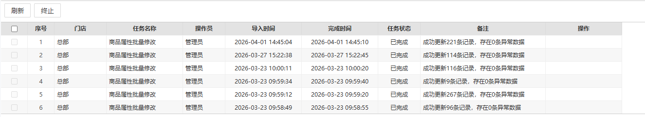 位置:【系统】-> 【系统维护】-> 【批处理中心】 【批量修改会员】 和 【批量修改商品属性】 进行的任务将会呈现在此处; 如图所示 如无成功修改变更,此处可查看到相关异常数据文档; 文档更新时间: 2026-04-20 08:19 作者:zhangyi