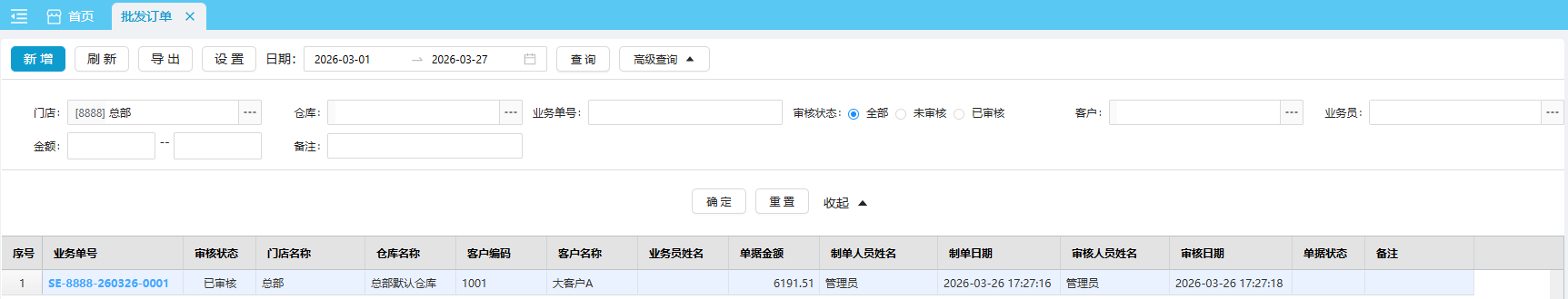 在批发订单列表中,默认显示本月本门店的所有的批发订单。