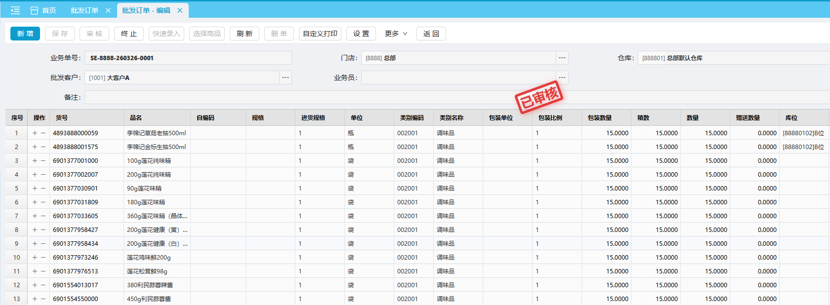 在批发订单新增界面可以录入批发订货的明细数据。
