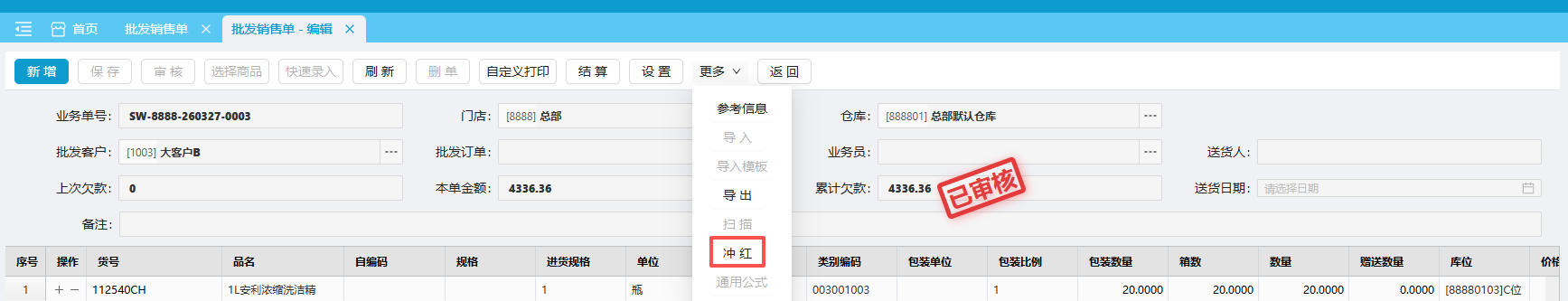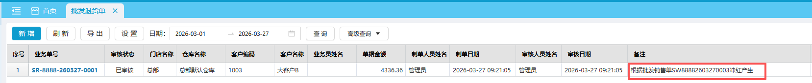 批发销售单审核后,如发现单据存在错误,可通过冲红方式生成对应的批发退货单。