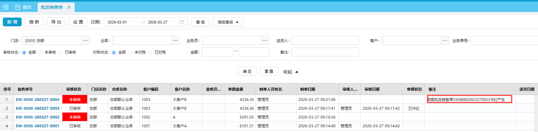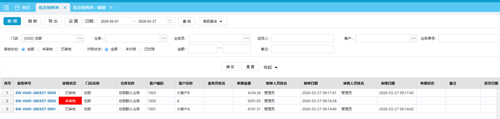 默认查看当前门店的本月批发销售单,可按日期、单号、客户、业务员、金额、审核状态、送货人和门店选择筛选条件。