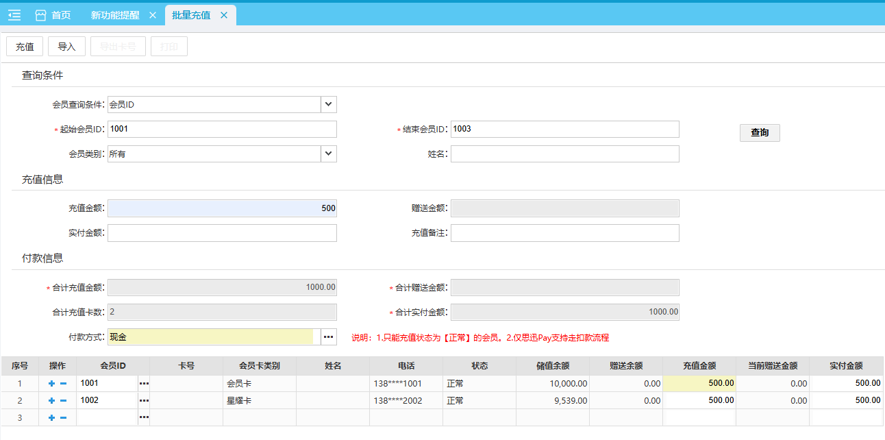 操作步骤:输入 起始/结束会员ID 点击 【查询】 后,根据实际情况在 充值信息 中 充值金额和赠送金额进行相关填写,在付款信息中输入实际支付的金额和付款方式,随机点击【充值】即可。