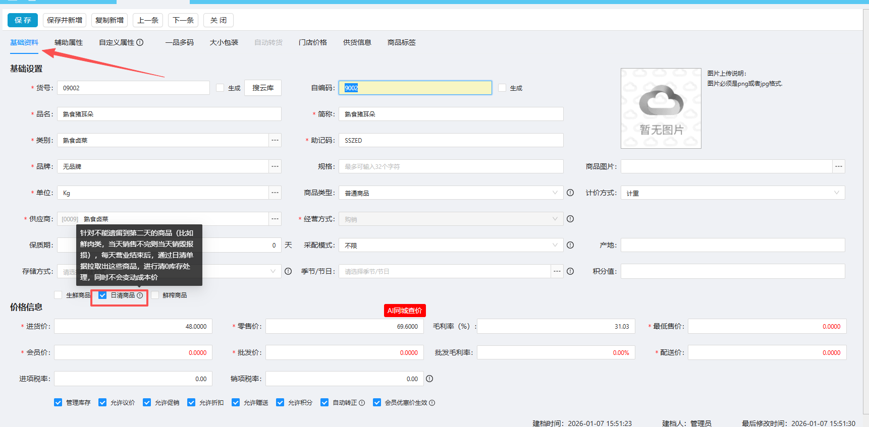 位置:【营运】-> 【生鲜】-> 【基础资料】-> 【日清商品】