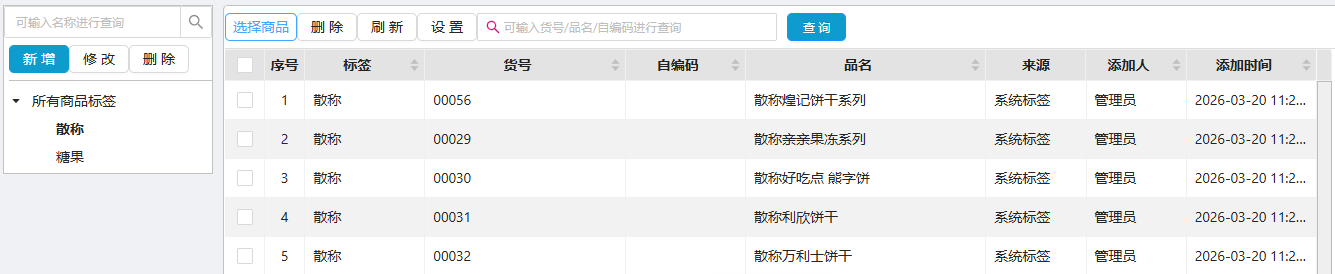 给商品建立标签,通过标签来管理商品。 位置:【营运】-> 【档案】-> 【基础信息】 如图所示 先建立标签,再选中标签添加商品;同步商品档案-商品标签,可在报表中根据标签 进行条件筛选 文档更新时间: 2026-04-20 03:24 作者:sundl
