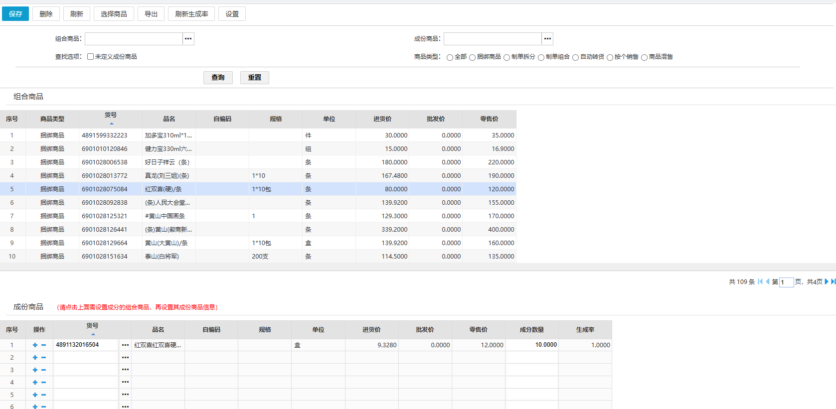 页面下部分:需要选择对应的组合商品,编辑当前主商品的成分商品,商品类型为“普通商品”。