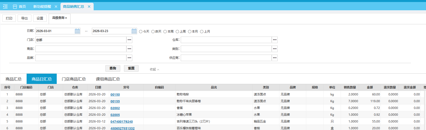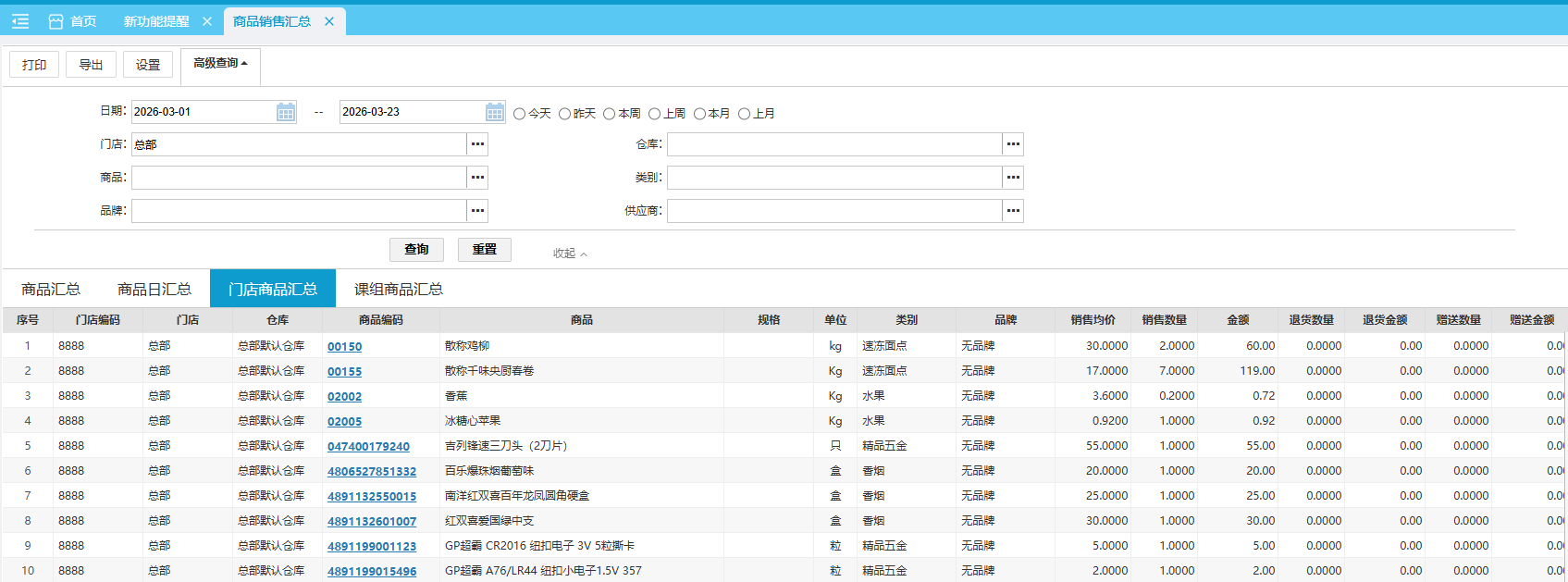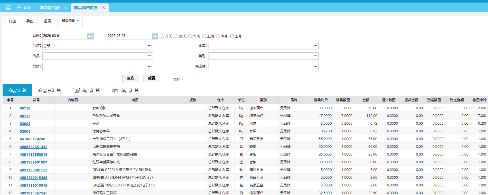 本系统提供多维度的销售数据汇总分析功能,包含商品汇总、商品日汇总和门店商品汇总三大模块,帮助用户全面掌握销售情况。