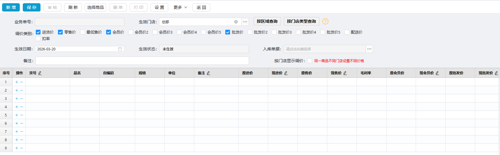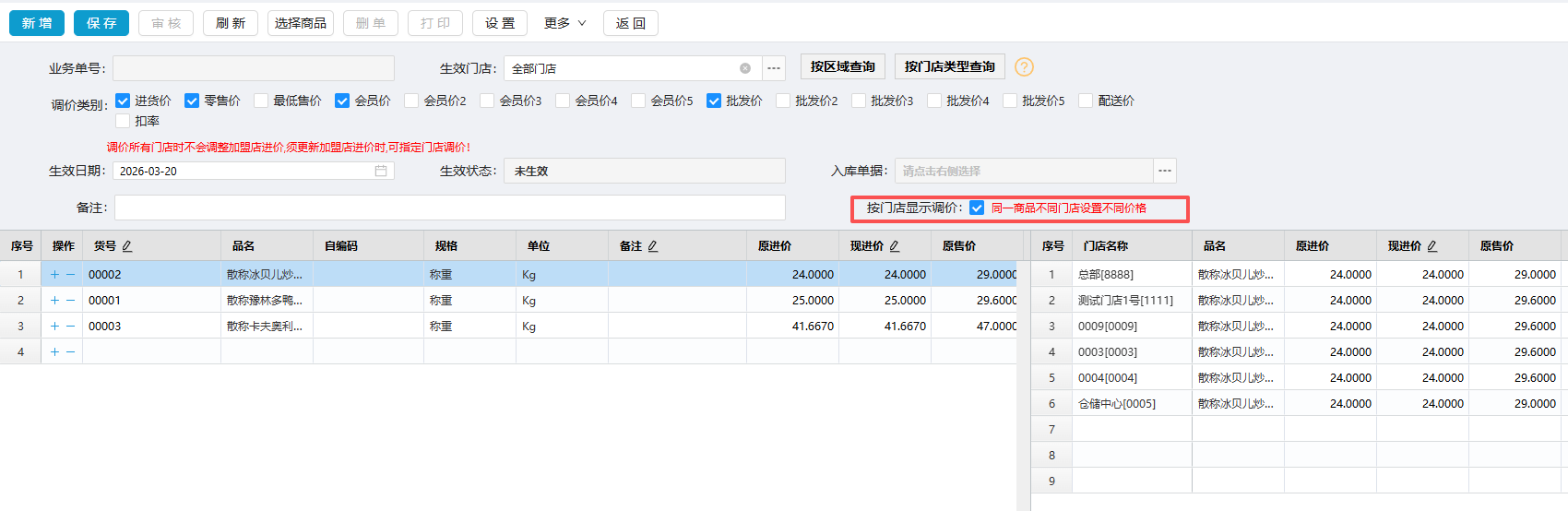 - 按门店显示调价:同一商品不同门店设置不同价格