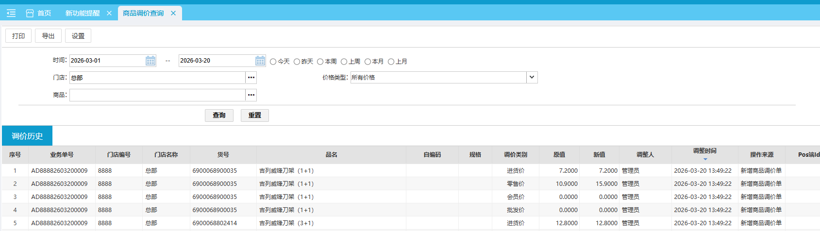 位置:【档案】-> 【商品查询】-> 【商品调价查询】