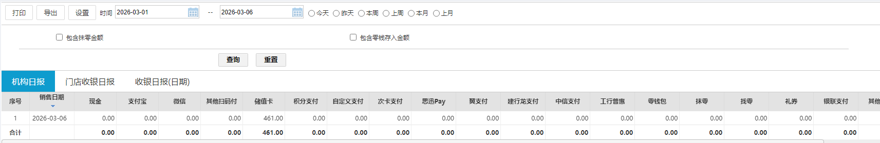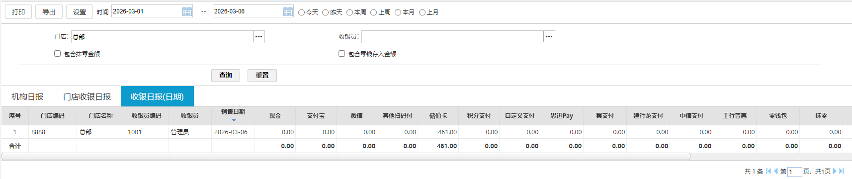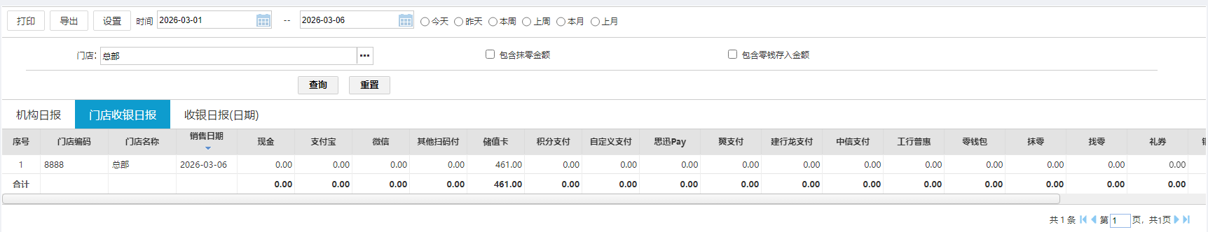按天查询对应门店的付款方式合计;