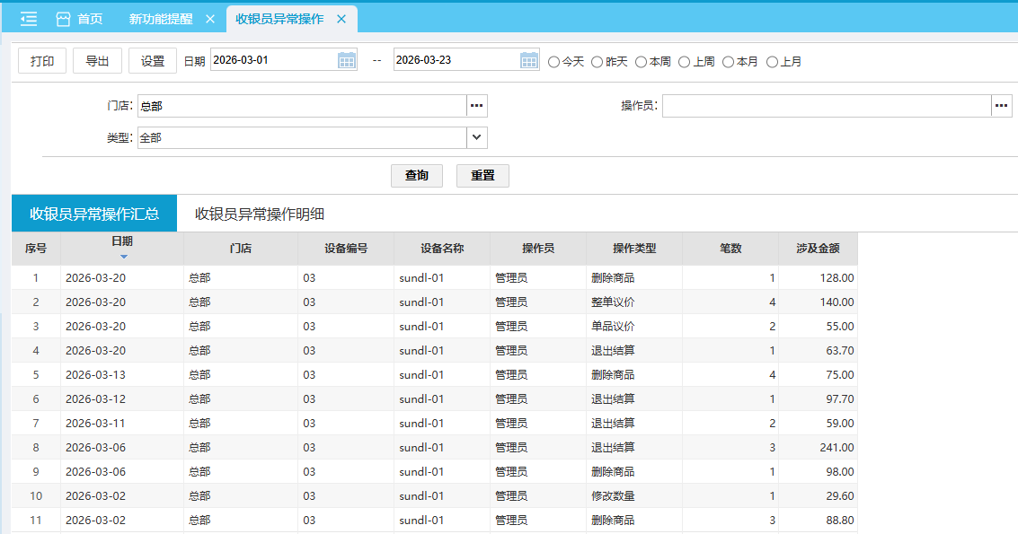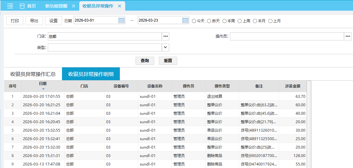 位置:【营运】-> 【卖场】-> 【零售查询】 收银员异常操作汇总查询日期范围内前台POS收银员异常操作汇总统计。 如图所示 操作类型:单品删除、取消结算、整单取消、单品议价 前台收银员异常操作后续保持登录10~30分钟 收银员异常操作明细查询日期范围内前台POS收银员异常操作明细数据。 如图所示 操作类型:单品删除、取消结算、整单取消、单品议价 前台收银员异常操作后续保持登录10~30分钟 文档更新时间: 2026-03-23 01:49 作者:zhangyi