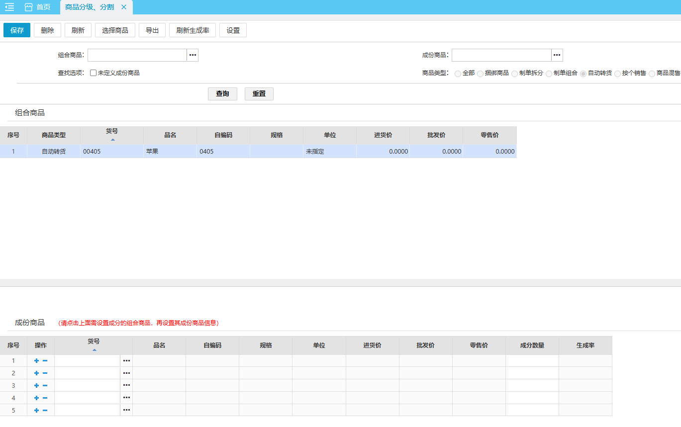 3、在商品分级、分割界面,选中组合商品中的苹果(61010)