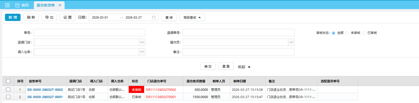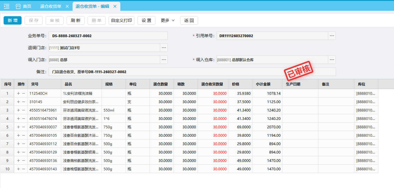 (2)退仓收货单审核后,调入门店的商品库存会增加,退调门店的商品库存不变化。
