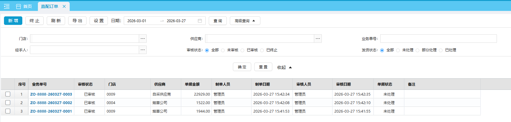 默认显示 当月 直配订单据,不区分单据状态;直配订单仅总部显示