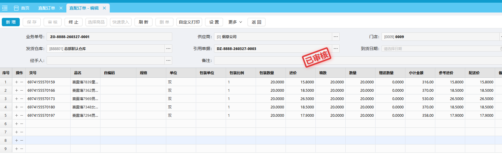 总部新增直配订单时,选择直配的门店、供应商等信息,录入\引用直配要货单据,发货仓库,核实配送的商品和数量,保存审核即可生效。