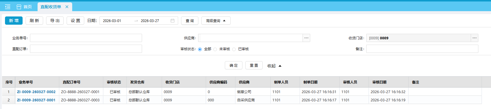 (1)直配收货单仅支持引用直配订单,审核后调出门店同步生成调拨出库单、采购收货单,调入门店同步生成调拨收货单;