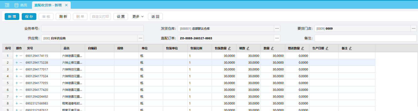 (3)单据明细:直配收货单只能引用直配订单,不支持手动添加/删除商品。