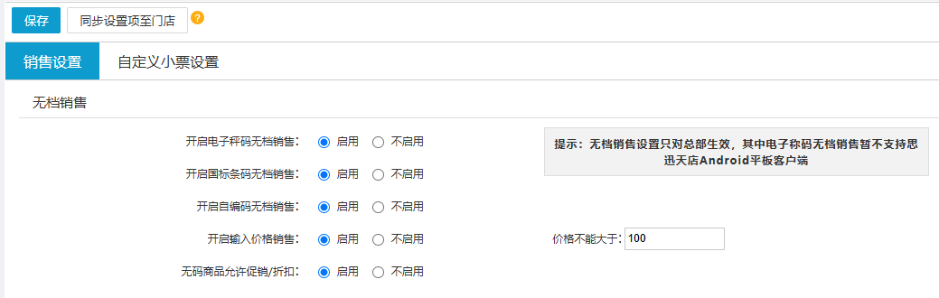 相关使用了解 点击可跳转>>>开启输入价格无档销售: 启用 不启用 价格不能大于: