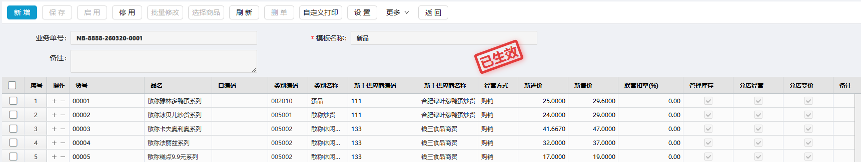 - 支持新店配置商品供应商:(决定经营方式、库存管理方式)、配置新进价、新售价、新联营扣率;