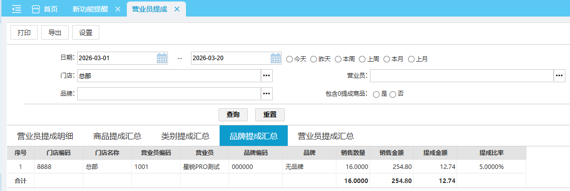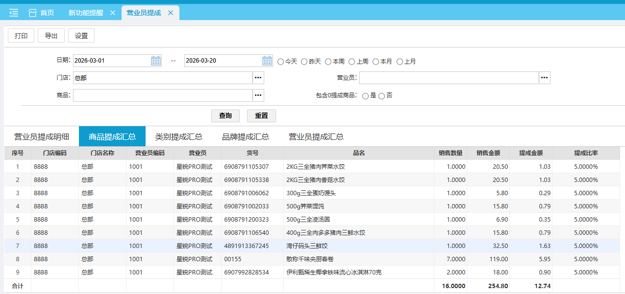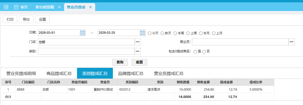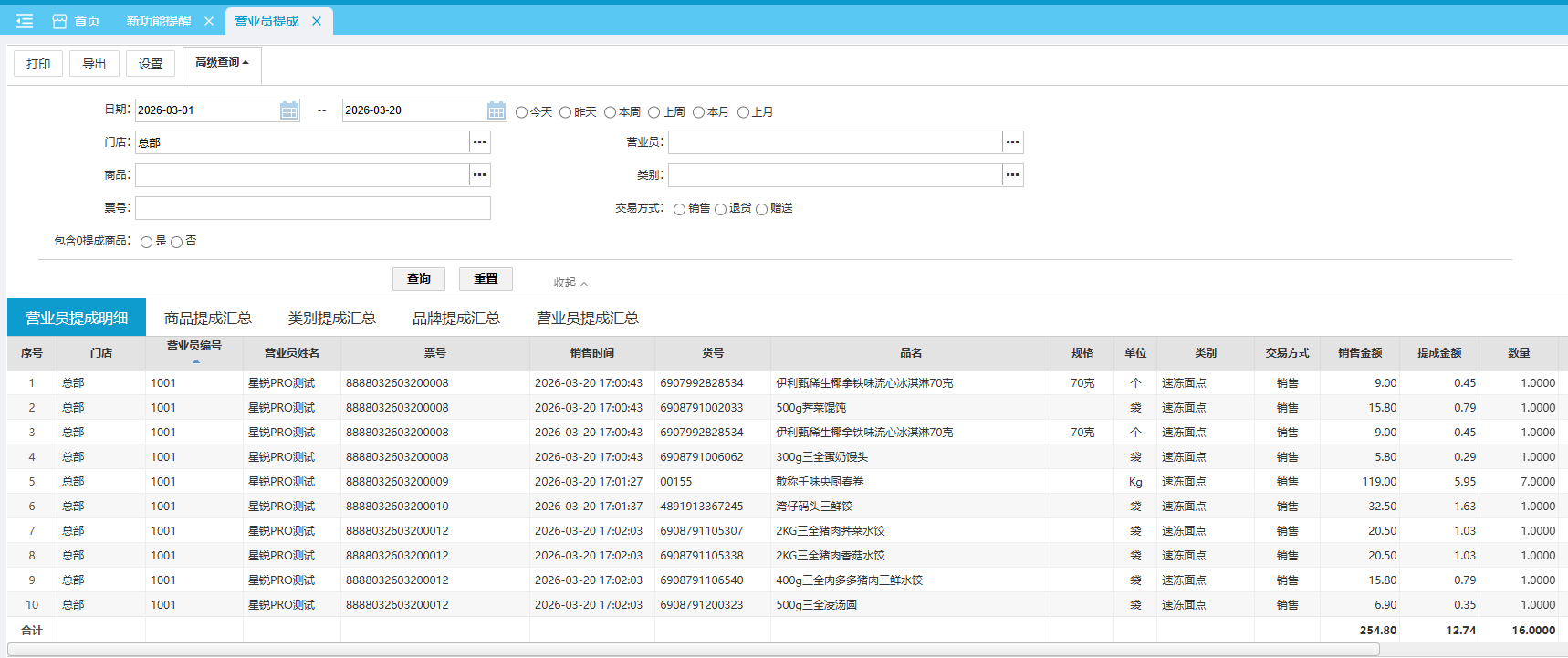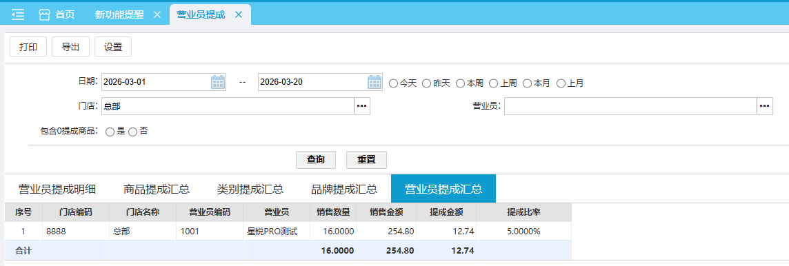 - 统计0提成商品:如果营业员未设置提成方式或设置提成金额为0,可勾选统计0提成商品查询销售金额。