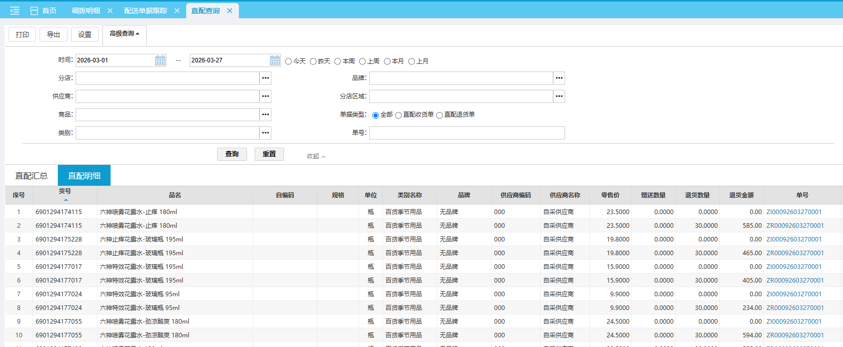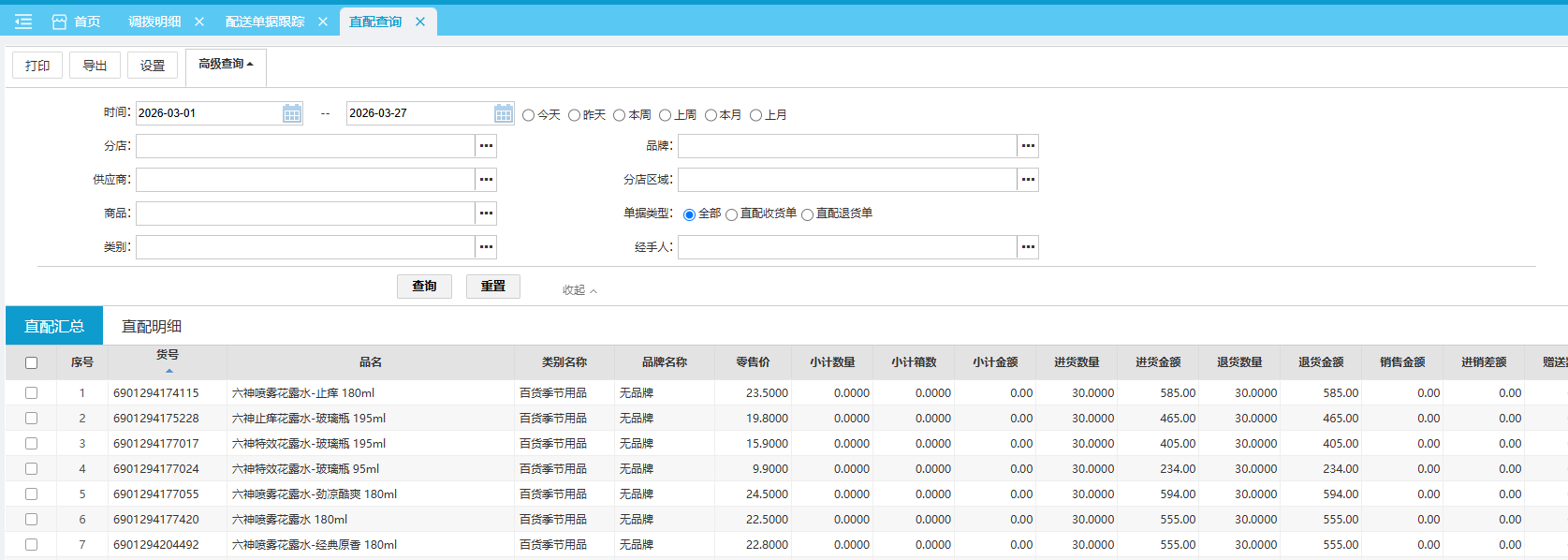 直配汇总直配明细 位置:【采配】-> 【配送】-> 【配送报表】 直配查询报表用于查询各门店的直配要货情况,可通过直配查询分析各门店直配要货汇总情况、各商品直配明细情况。 直配汇总默认查询本月、各门店各商品的直配汇总。 如图所示 直配明细默认查询本月直配收货单、直配退货单据所有明细商品。 如图所示 文档更新时间: 2026-03-27 08:41 作者:sundl