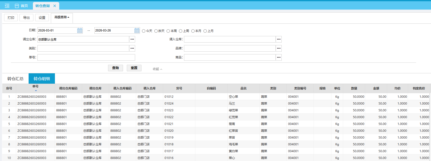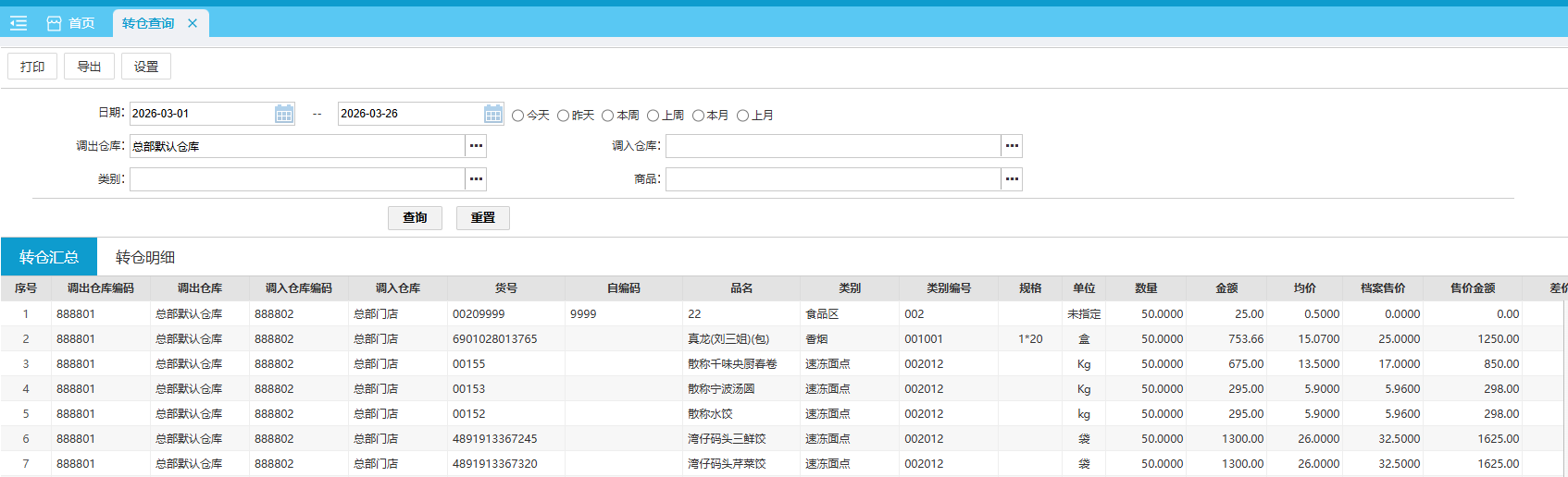 转仓汇总转仓明细 转仓查询可以帮助查询有转仓业务的数据。 位置:【营运】-> 【库管】-> 【业务查询】 (1)报表数据来源转仓单。(2)只有总部才能查询转仓数据。 转仓汇总默认查询当月 调出仓库为默认总仓 调入给其他仓库的转仓汇总数据。 如图所示 转仓明细默认查询当月 调出仓库为默认总仓 调入给其他仓库的各转仓单明细数据 如图所示 文档更新时间: 2026-03-26 01:58 作者:zhangyi