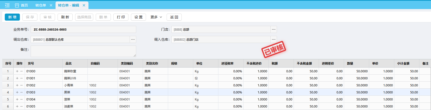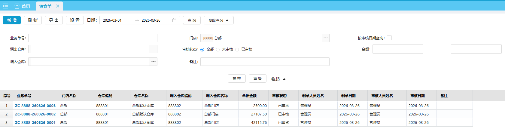 转仓单是用于同一机构下不同仓库之间商品的转移操作,将商品从总部下的某个仓库转移到另一个仓库。
